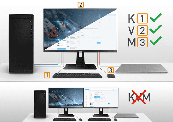 Monitor z przełącznikiem KVM umożliwia udostępnianie urządzeń peryferyjnych podłączonych przez USB do monitora dwóm różnym komputerom. Wystarczy zmienić wejście sygnału w menu OSD monitora, a klawiatura, mysz i kamera internetowa zostaną przełączone z laptopa do pracy na komputer do gier.